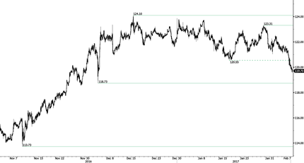 Lentamente, la coppia USD/JPY spinge verso il basso. La resistenza oraria è data a 115,62 (massimo 19/01/2016). La struttura tecnica lascia presagire un ulteriore momentum con la violazione del supporto orario a 112,57 (minimo 17/01/2017) a conferma delle pressioni ribassiste. Siamo a favore di un’impostazione ribassista a lungo termine. Un supporto giace attualmente a 96,57 (minimo 10/08/2013). Appare assolutamente improbabile un graduale rialzo verso la forte resistenza a 135,15 (massimo 01/02/2002). Si prevede un’ulteriore flessione verso il supporto a 93,79 (minimo 13/06/2013).